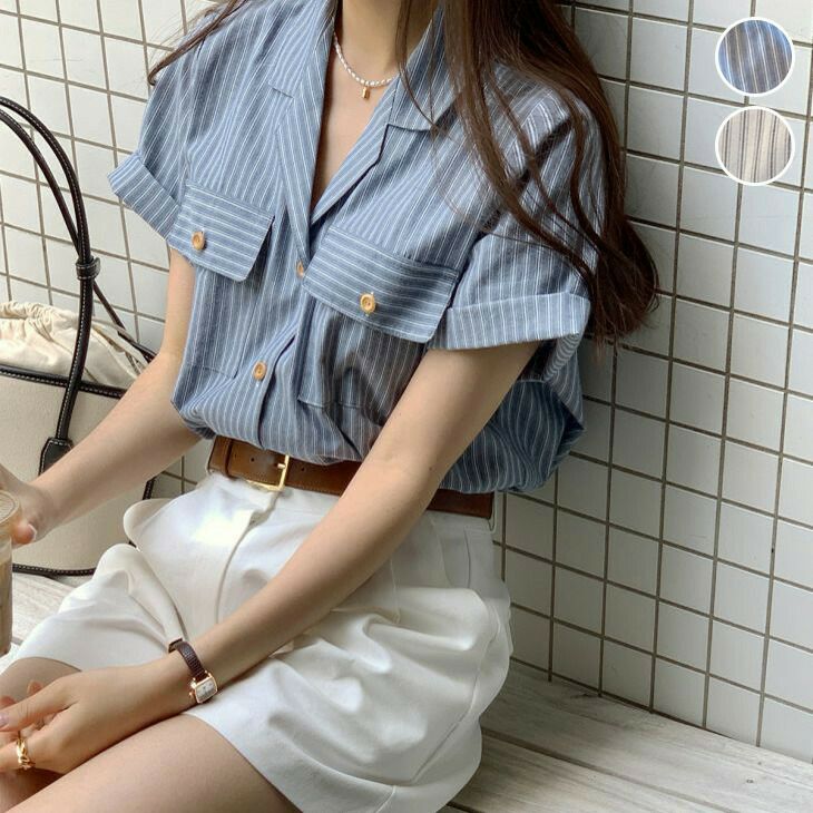 開襟ストライプシャツ ストライプ シャツ ブラウス オフィス [AMELY by La-gemme]開襟ストライプシャツ ストライプ シャツ ブラウス オフィス ブルー きれいめ シンプル カジュアル韓国ファッション 【atp406-187】【予約販売:15-20日】【送料無料】ユ込2
