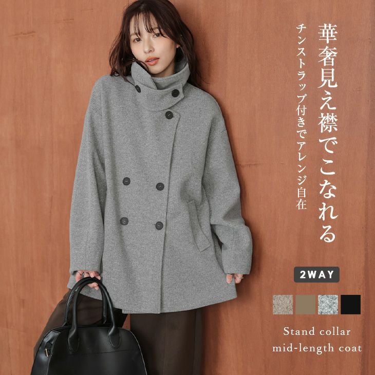 スタンドカラーコート スタンドネック ミドル丈 【秋冬半額SALE対象】 [AMELY by La-gemme]スタンドカラーコート スタンドネック ミドル丈 アウター ダブルボタン チンストラップ付き 2WAY キレイめ レディース おすすめ おしゃれ フリーサイズ 2025秋冬新作【aotaw25-1668】【即納:1-5営業日】【送料無料】宅込