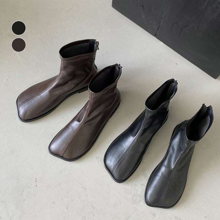 スクエアトゥ ショートブーツ 靴 ローヒール ぺたんこ [AMELY by La-gemme]スクエアトゥ ショートブーツ 靴 ローヒール ぺたんこ ファスナー 合皮 PU ラムレザー風 シンプル きれいめ カジュアル お洒落 レディース 大人 春夏 プチプラ 韓国ファッション【ash209-029】【即納:1-5営業日】【送料無料】宅込