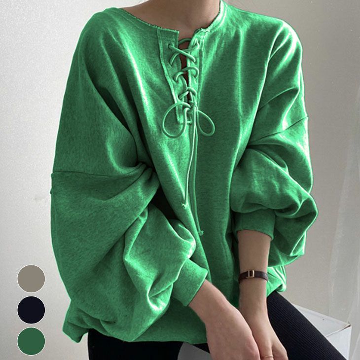 レースアップ トレーナー ボリューム袖 トップス [AMELY by La-gemme]レースアップ トレーナー ボリューム袖 ランタンスリーブ トップス プルオーバー オーバーサイズ りぼん 春夏 レディース 韓国ファッション 【atp208-606】【即納:1-5営業日】【送料無料】ヤ込2