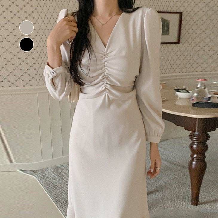 [AMELY by La-gemme]Vネックギャザー ワンピース マーメイドワンピース [AMELY by La-gemme]Vネックギャザー ワンピース マーメイドワンピース パーティー ドレス ミモレ丈 マーメイド 韓国ファッション デート 【awp302-232】【即納:1-5営業日】【送料無料】メ込4