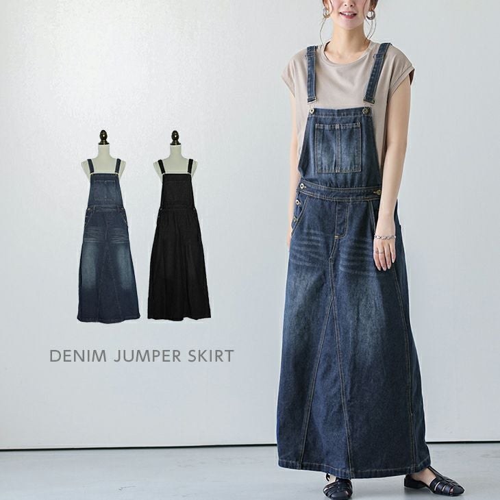 ロング丈 ジャンパースカート オールインワン レディース デニム ジャンパースカート オールインワン 楽ちん Aライン 定番 ロング丈 ジャンスカ サロペット 体型カバー カジュアル スカート マキシ ボトムス M/L 2025春夏【lgww-at3573】【即納:1-5営業日】【送料無料】ヤ込