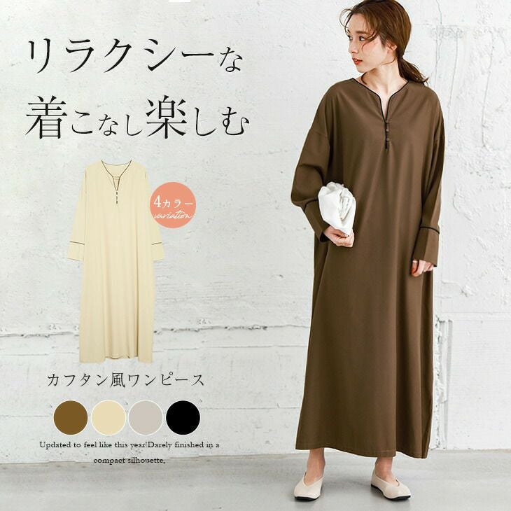 カフタン ワンピース レディース パイピング マキシ丈 【春夏半額SALE対象】 カフタン ワンピース レディース パイピング マキシ丈 ロング丈 オーバーサイズ キーネック ゆったり トレンド リラックス 大人 トレンド おしゃれ ブラック メール便 2025秋新作 フリー 【lgww-at4310】【即納:1-5営業日】【送料無料】メ込2