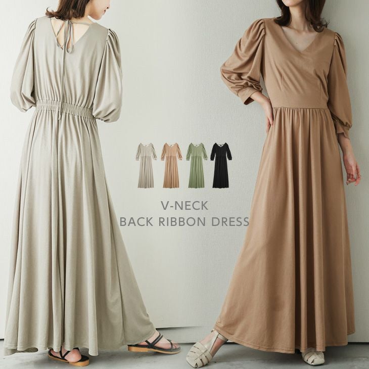 ロングワンピース Vネック バックリボン 7分袖 フレア ロングワンピース Vネック バックリボン 7分袖 フレア ボリュームスリーブ レディース おすすめ おしゃれ ブラック メール便 2025秋新作 【lswp203-396】【即納:1-5営業日】【送料無料】ヤ込1