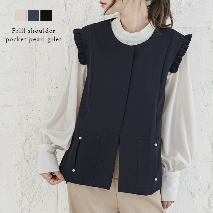 ジレ フリルショルダー パール ベスト アウター 【春夏半額SALE対象】 [AMELY by La-gemme]ジレ フリルショルダー パール ベスト アウター サイドスリット 大人可愛い キレイめ レディース おすすめ おしゃれ フリーサイズ メール便 2025春夏新作 【aot301-670】【即納:1-5営業日】【送料無料】メ込1